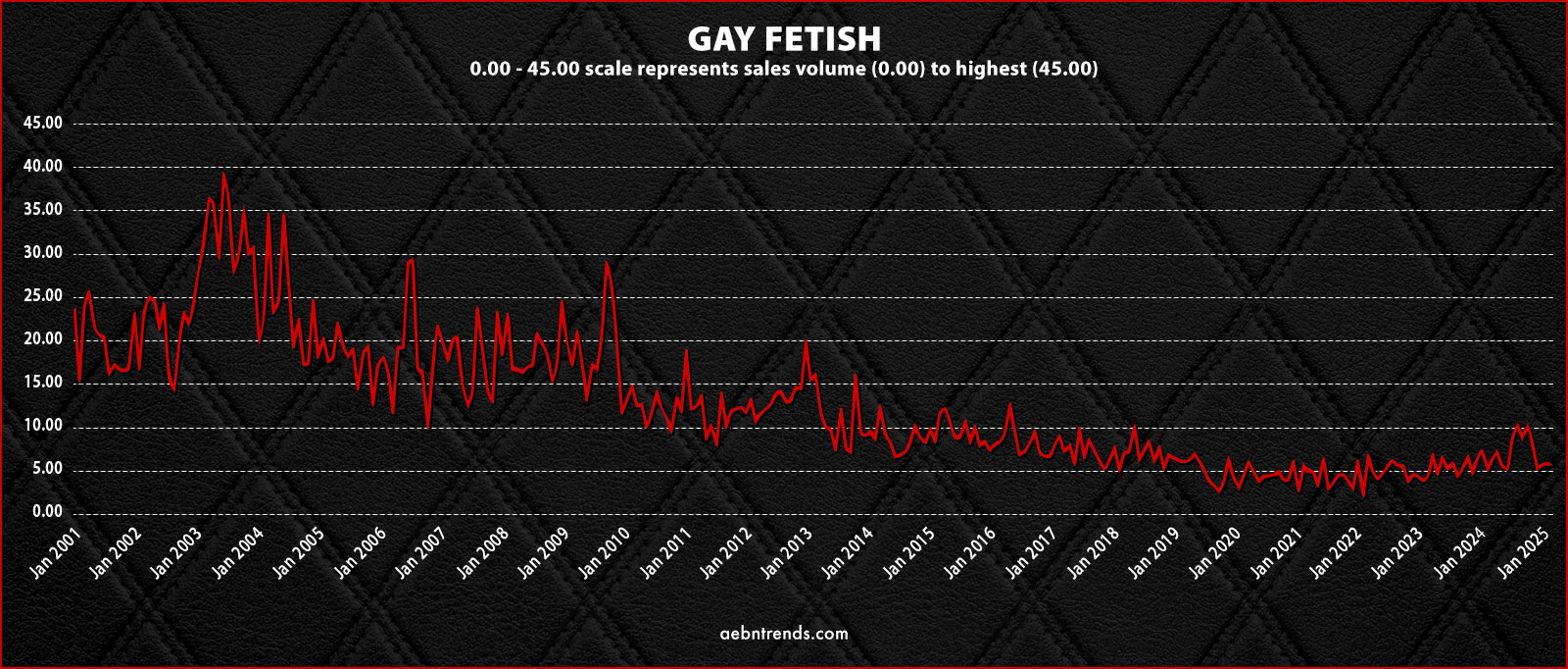 Gay fetish content is holding steady in its popularity over the last many years, but it is on the decline from what it was in the early 2000s. It has been in the top 15 most popular categories of content most every year over the last decade.