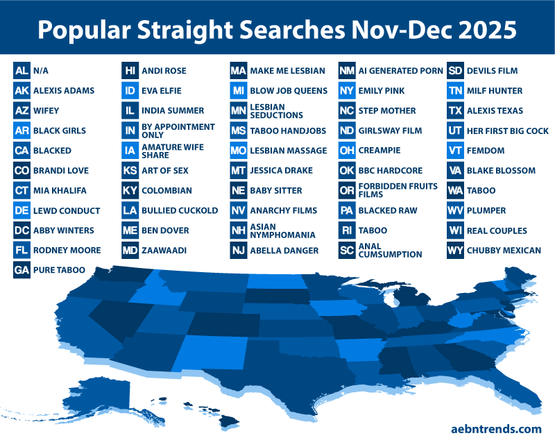 Taboo storylines were popular over the months of November and December with searches including “step mother” in North Carolina, “taboo handjobs” in Mississippi, “taboo” in both Rhode Island and Washington, as well as popular taboo studios “Pure Taboo” in Georgia, and “Forbidden Fruits Films” in Oregon